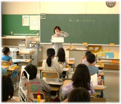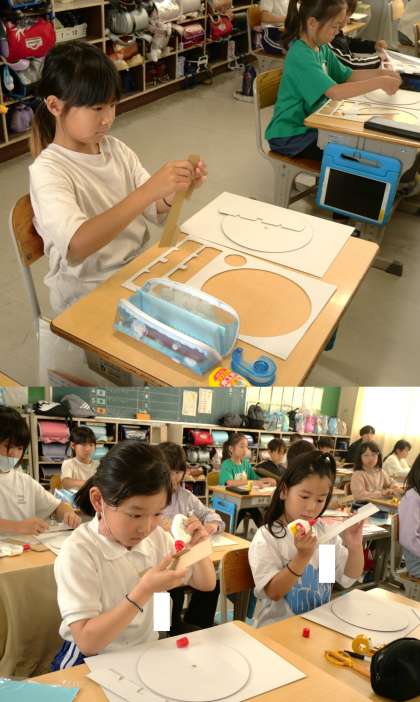 (写真中・下)3年2組 図画工作科:わりピンを使って、自分オリジナルのわりピンワールドの制作を行っています。何をどのように動かすかを考えながら、取り組んでいます。