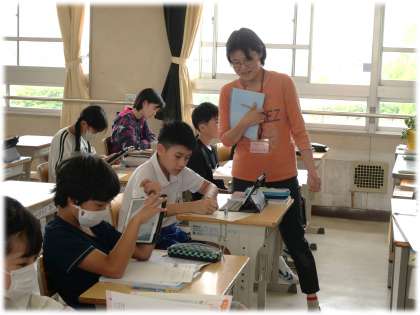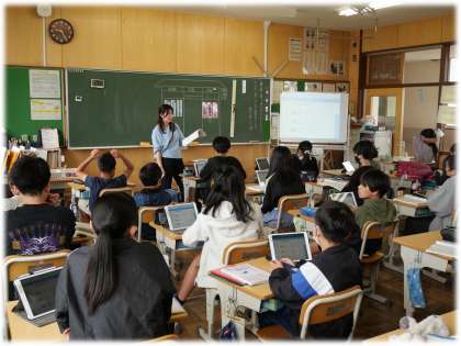 (写真上)6年1組 国語科:単元「イースター島にはなぜ森林がないのか」の学習を進めています。筆者の論の進め方を捉えるために、まずは形式段落を「序論・本論・結論」に整理していこうと、自分の考えを出し合いながら取り組んでいました。