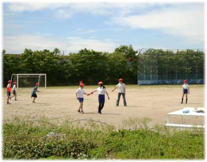 (写真下)6年3組 体育科:リレーのバトンパスの練習を行っています。渡すタイミングや、その際の声掛けなど、自分たちで考えながら練習に取り組んでいました。