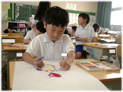 (写真上・中)2年2組 図画工作科:「ふしぎなたまご」を想像して、伸びやかに表現しています。書きながら、「ぼくのたまごはね、・・・」と、自然と会話が弾んでいます。2年生の瑞々しい感性に感心します。