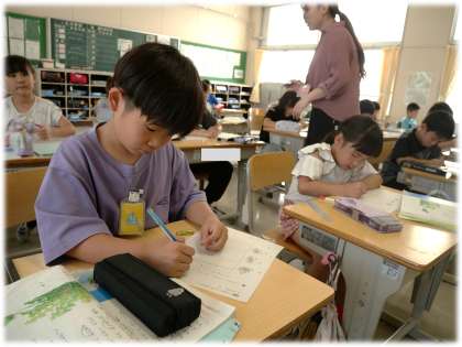 (写真下)2年3組 国語科:「たんぽぽ」の仲間の増やし方を読み取っています。教材文のどこに着目すればよいのかを確かめながら、まずは一人調べを行っていました。