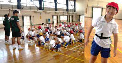 今日は、トヨタヴェルブリッツの選手の方を講師に迎え、タグラグビー体験会を学級ごとに行いました。ボールの扱い方、タグ取りゲーム、ゲームと段階を踏んで、楽しく体験を行うことができました。
