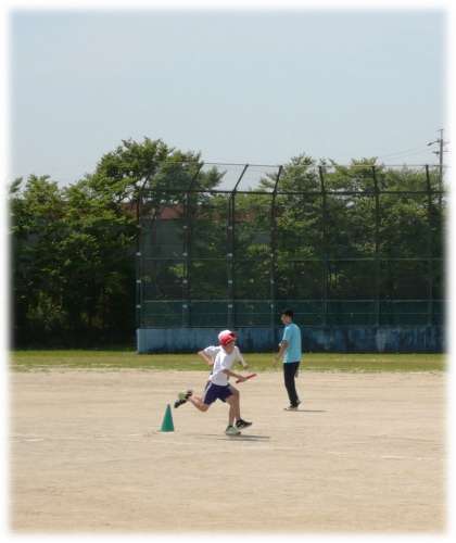 (写真中)6年2組 体育科:リレーに取り組んでいます。自分のチームの仲間を応援する声も仲間の走りを後押ししていました。