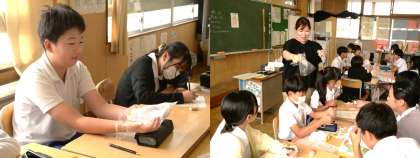 (写真上)6年1組 家庭科:下着の役割を考えるための実験を行っていました。素手と軍手をはめた手にビニール袋をかぶせた代表者が、時間経過後、ビニール袋を外します。