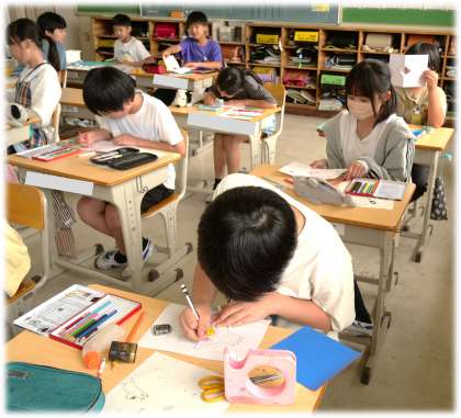 (写真中)6年2組 図画工作科:紙を折ってできる形を生かして、作品づくりに取り組んでいます。鳥のくちばし、ピエロの口など、それぞれの発想が違って、おもしろみがあります。互いの作品を見合うのが楽しみですね。