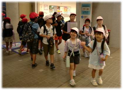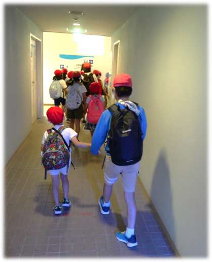 館内は薄暗いところがあり、また、平日でも大勢の方がお見えで混雑もしています。だからこそ、6年生は場所を移動する際には、必ず「みんないるかな」と班のみんなを気にかけ、声をかけ、人数を確認しています。さらに、そんな6年生を支えるように、5年生も自分にできることをしようと、下学年の手をにぎりながら移動しています。