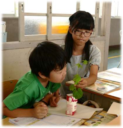 (写真上・中)4年1組 理科:ツルレイシの観察をしています。葉の数や見た目、香りなども書いて、観察ノートに記録しています。つるの伸び方に注目している人もいました。