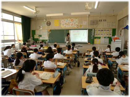 (写真下)4年2組 国語科:単元「走れ」の学習が始まりました。まず、学習の見通しをもつために、朗読を聞きながら、物語の大筋をつかみます。
