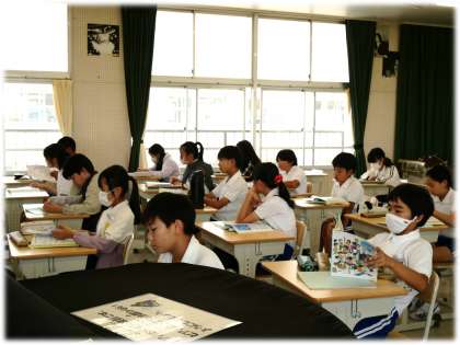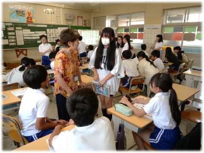 (写真下)6年3組 外国語科:グループワークも積極的に取り組む6年生です。チャレンジとナイスリアクションで互いにかかわり合っています。