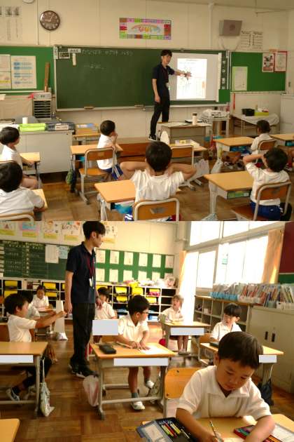 (写真上)1年1組 生活科:七夕の日に向けて、自分の願い事をカードに書いています。ていねいな字で書く姿に、気持ちがこもっていることを感じます。