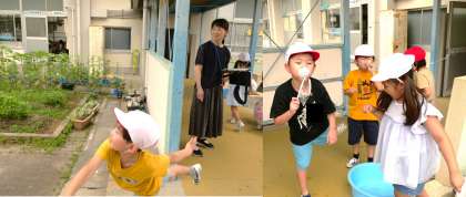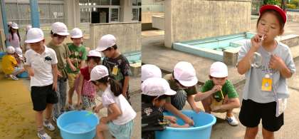 (写真中・下)1年2組 生活科:自分なりに「大きな」「多くの」シャボン玉をつくるために、用意してきた道具たち。ストローの先日を広げたり、太いものにしたり、うちわの骨組み部分を利用したり、ハンガーを丸くしたりと、それぞれに工夫をしています。さて、思いどおりのシャボン玉をつくることができたでしょうか。