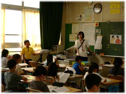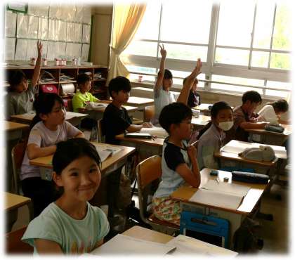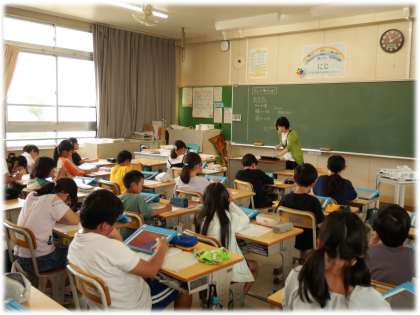 (写真上)4年1組 社会科:ダムのはたらきについて、資料をもとに考え合っています。