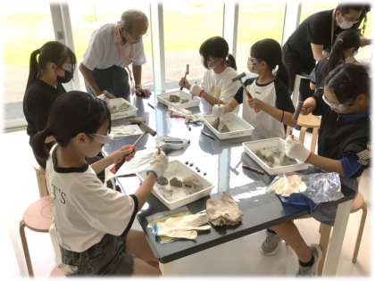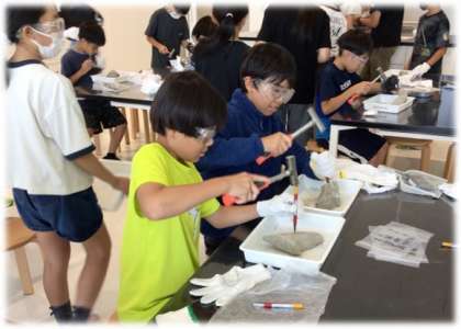 豊田市博物館へ出かけ、常設展示や特別展示の古代エジプト展を興味深く見学したり、岩石から化石を採掘する実体験を行ったりしました。また、保護者が準備してくれたお弁当を仲間と一緒に楽しく食べる経験も心に残ったようです。