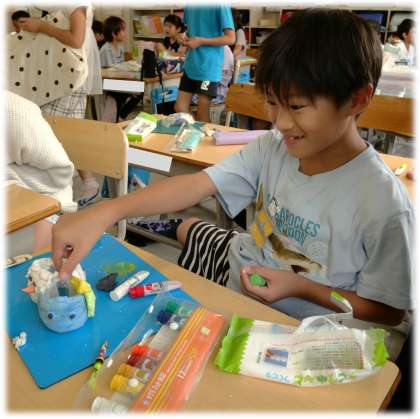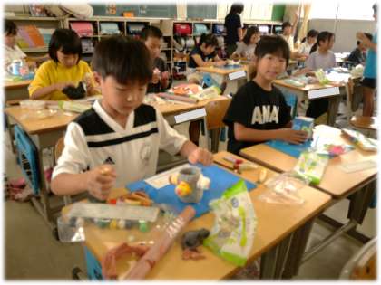 (写真中・下)3年2組 図画工作科:空き瓶や空き箱などと紙粘土を使って、自分だけのオリジナル小物入れをつくっています。いろいろなアイデアが出てきて、作る側も、友達が作っているところを見る側もみんな楽しそうです。