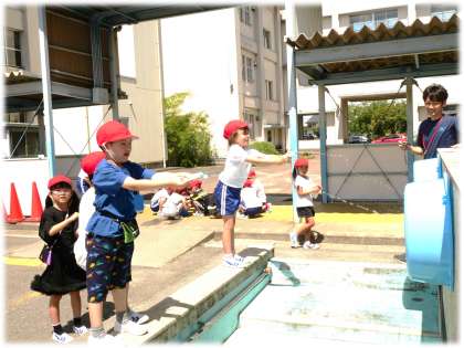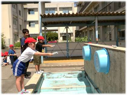 (写真上・中)1年1組 生活科:「みずとなかよくなろう」の学習です。大きなたらいを的に見立て、容器から勢いよく水を飛ばして的当てを行っています。「えい!」と、元気よく活動を楽しむ1年生です。
