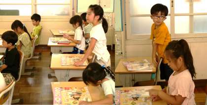 (写真下)1年2組 図画工作科:「じぶんのだいすきなごちそうをつくろう」と、粘土を使って作る料理を考えるわくわくした時間が流れます。まずは、教科書に載っている写真をもとにイメージを広げます。「5段のパンケーキだね」「これはカップケーキだよ」「お寿司は、お稲荷さん、いくらにマグロ、たまごもあるね」早く作り始めたいわくわく感が伝わってきます。