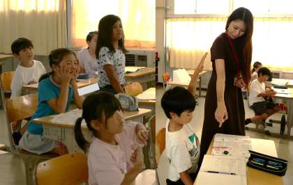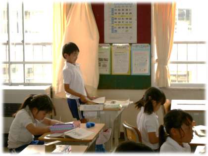(写真上)2年1組 算数科:単元「かさ」の学習を進めています。1Lが10dLになることを確かめた子どもたちは、身の回りのかさの量を確認し始めます。「1L=10dLを使えば解けるよ」自信をもって考えています。
