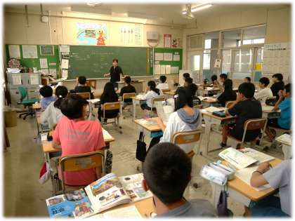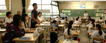 (写真下)6年3組 社会科:古事記や日本書紀、風土記について、どのようなものかの説明を熱心に聞いていました。