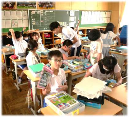 (写真上)5年1組 夏休み前にお道具箱を整理整頓しています。自分なりに整頓できたら担任にも確認してもらっています。「これは、いいねえ」「これは、このままでいいかな」そんな言葉がけで、笑顔になったり、悔しそうに再チャレンジする5年生です。