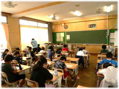 (写真下)5年2組 テストに集中して取り組んでいます。夏休み前で心はうきうきしているでしょうが、めりはりをつけて取り組めるのはさすが高学年です。