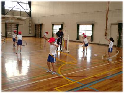 (写真上)2年1組 体育科:フラフープを使って、全身運動に取り組んでいます。エアコンのある体育館ですが、身体を思いっきり動かし、汗もたっぷりかいています。適宜、水分補給と休憩を取りながら、元気に活動しています。