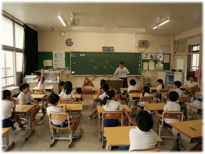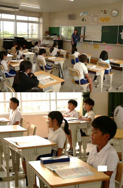 (写真下)2年3組 生活科:7月までの学習でどのようなことを学んできたのか振り返っていました。友達の発言もよく聞いて、「○〇さんに似ていて」「〇〇さんにつけたして」と、「そうだった、そうだった」とどんどん思い出していました。