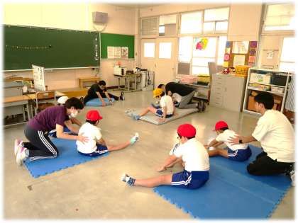 9月3日(水)5678組 今日の授業の様子 公開日 2025/09/03 更新日 2025/09/03 各学年から 今日もWBGTが31度を超え、運動場で運動は中止です。急遽、教室にマットを敷いて、柔軟運動に取り組む子どもたちです。担任の掛け声に合わせて、イッチニッと開脚前屈のストレッチを行っていました。 5678組