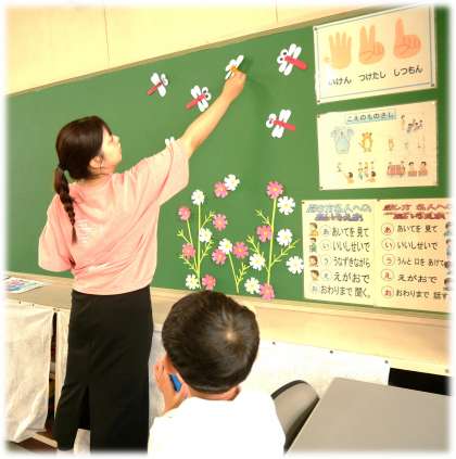 5組の教室では9月の掲示物づくりを学級のみんなで行い、季節を感じるすてきな掲示が完成しています。一人一人が思い思いのとんぼをつくりました。その掲示物をながめると秋風を感じることができます。