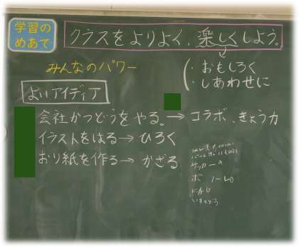 2年生のある学級をのぞくと、黒板に前時の学級活動での話し合いの様子が残されていました。2年生が自分たちの学級を自分たちで創り上げていくために、一生懸命に考えている様子が伝わってきます。「楽しく」あるのは、決して自分だけではなく、「自分も仲間も」という視点を大切にしている思いが「しあわせに」という言葉に込められています。胸があたたかくなります。