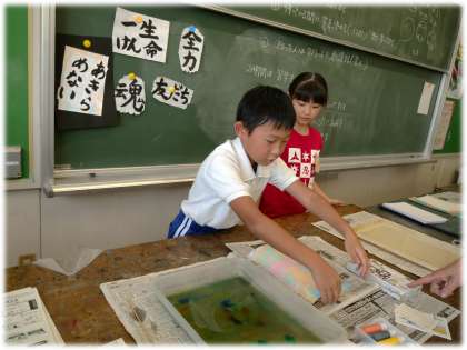 9月9日(火)3年生 今日の授業の様子 公開日 2025/09/09 更新日 2025/09/09 各学年から (写真上)3年1組 図画工作科:水に好みの絵の具をたらし、そっと紙を浮かべてマーブル模様になったすてきな台紙を制作しています。この後、自分のお気に入りの漢字や言葉を中心に張り付けるようです。完成が楽しみです。 (写真中・下)3年2組 道徳科:きまりがあるのはなぜかを、自分たちの生活を振り返りながら自分の言葉で伝え合っています。 3年生
