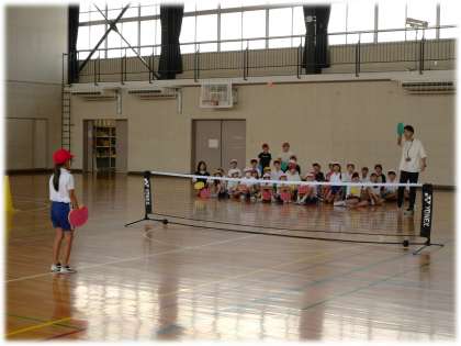 (写真下)4年2組 体育科:テニピンの学習が始まりました。一人一人、手にスポンジのラケットを身に付け、早くやりたくて、わくわくしている様子が伝わってきます。基本的なボールの打ち方の説明を聞き、まずは教員と代表者のお手本に注目です。ラリーが続くと、自然と拍手が沸き起こりました。