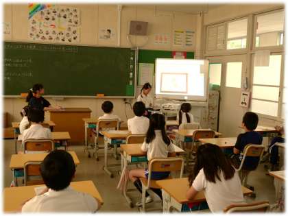 (写真上)3年1組 総合的な学習の時間:夏休み中に取り組んだオリジナル献立の発表を行っていました。発表者が実際に作った献立を写真を示しながら説明すると、「すごいね」「おいしそうだな」「作ってみたい」などのつぶやきが聞こえてきます。