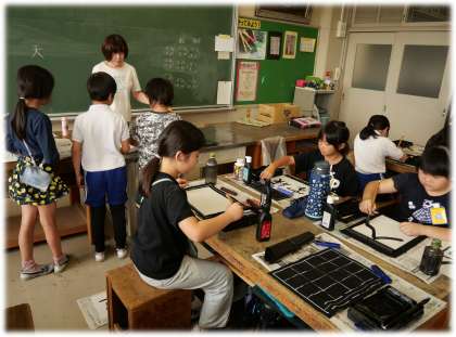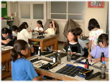 (写真中・下)3年2組 図画工作科:マーブリングで作成した台紙に飾る自分の好きな言葉を習字で書いています。「空」「天」「勝」「美」「自分の名前」など、思いを字にこめています。