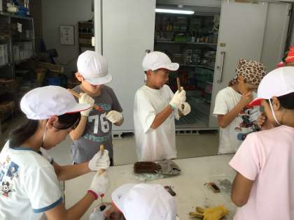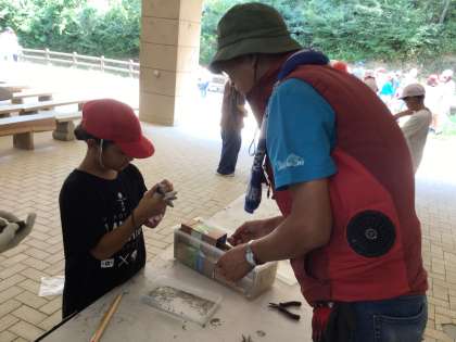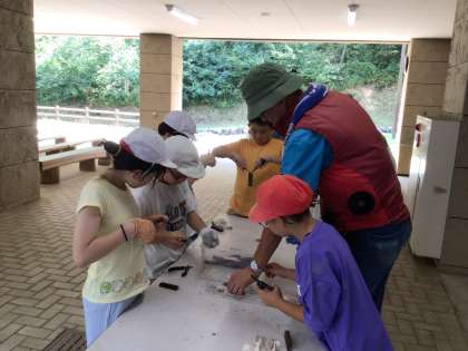 9月17日(水)5年生 最幸でBESTなキャンプを40 公開日 2025/09/17 更新日 2025/09/17 学校行事 きりで穴をあけ、金具を取り付けます。所員の方もサポートしてくださいます。 5年生 5678組 行事
