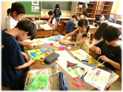 9月18日(木)4年生 今日の授業の様子 公開日 2025/09/18 更新日 2025/09/18 各学年から (写真上)4年1組 社会科:明日の公共施設見学に向けての事前学習を行っています。学んだことを実際に施設を見学する中でさらに深めていけるとよいですね。 (写真中・下)4年2組 図画工作科:色セロファンと色紙を組み合わせて、自分の描く世界を表現しています。平面に張り付けるだけではなく、立体的に張り付ける工夫も見られ、色の重なりを楽しんでいる様子が伝わってきます。 4年生