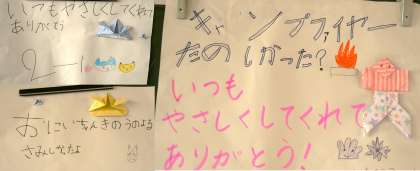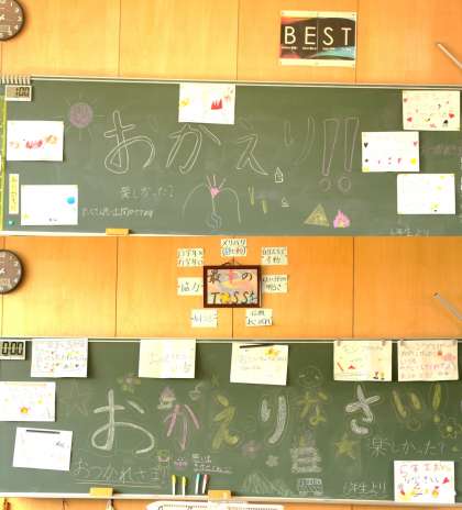 今朝の5年生の教室には、それらに加えて、6年生と2年生からのあたたかい「おかえりなさい」メッセージが黒板いっぱいに書かれていました。野外学習(キャンプ)は、5年生の学年行事ですが、他学年も応援してくれていることが伝わってきます。駒場っ子のやさしさがつまっています。