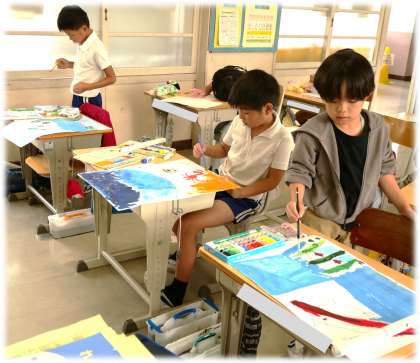 (写真上)2年1組 図画工作科:読書感想画に取り組んでいます。