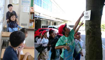 (写真上)3年1組 理科:植物の成長の振り返りを行っていました。学んだ大切な理科言葉を使いながら、みんなで学びを確認し合っています。その後、校庭に出て動物のすみかを探索です。2年生の生活科での学びがつながっていきます。