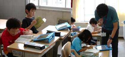 (写真下)3年2組 国語科:国語辞典や学習用タブレットを使って、慣用句調べを行っています。動物や植物に関するものや心に関するものなど、言葉のもつおもしろさを感じて、夢中になって調べている3年生です。