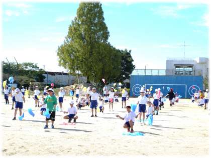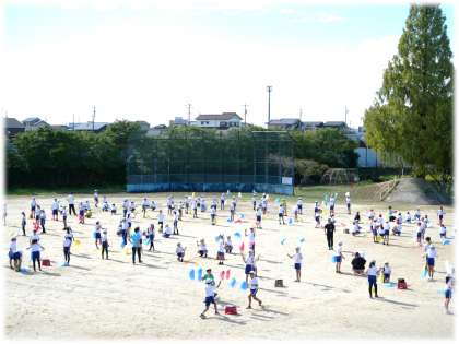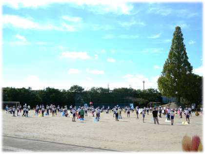 1校時、5・6年生が合同体育を行い、運動会で披露するトーチワーク練習を行っていました。6年生のダンスリーダーが中心となって小グループごとに練習を行いながら、授業の最後には全員で動きを確認していました。青空のもと、トーチ棒が回転する音がリズミカルに聞こえてきました。