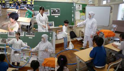 調理員の方が、毎日実際にそんな言葉を唱えながら作っている場面を見て、笑みがこぼれる子どもたち。これからの給食の時間が待ち遠しくなる1年生でした。