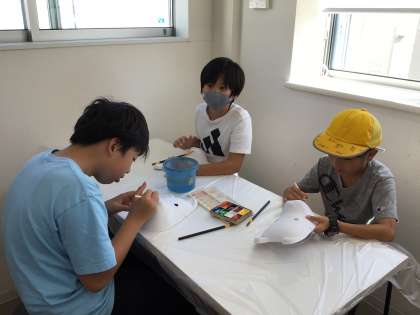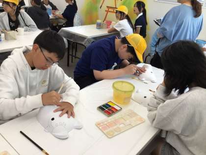 狐面の色塗り体験では、どのような模様を描こうか、どのような色彩にしようかと自分らしさを表現していました。体験をサポートしていただいたあかね屋の方も6年生のアイデアに感心してみえました。
