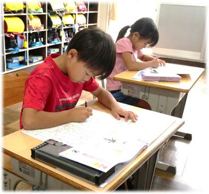 (写真上)1年1組 国語科:背筋をぴんと伸ばして、よい姿勢で新出漢字の書き取りに取り組んでいます。