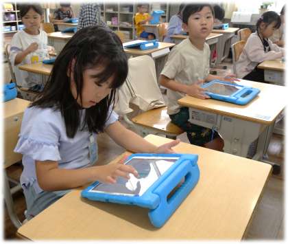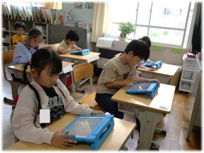 (写真中・下)1年2組 算数科:学習用タブレットのQubenaで学習したいろいろな数について復習して取り組んでいます。「ピコン!」と学級のあちこちで、正解時に鳴る音が聞こえてきました。