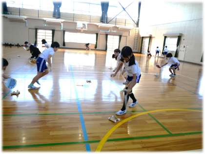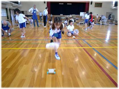 第1号の車が出来上がると、早速体育館後ろのスペースで、うちわで風を起こしながら、車を走らせます。何度も走らせたり、友達の車の走りを見たりしながら、「もっと速く走らせたい」「まっすぐスムーズに走らせるためにはどうしたらいいかな」と、新たな思いをもっていることが伝わってきます。