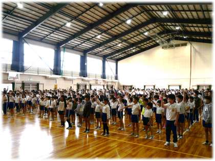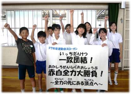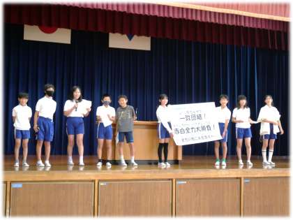 テーマを通じて、子どもたちの運動会に向ける思いが伝わってきます。企画委員会の音頭で全校で元気いっぱいに運動会テーマを呼びかける場面でも、今年度の運動会が楽しみになる大きな声が体育館中を包み込みました。