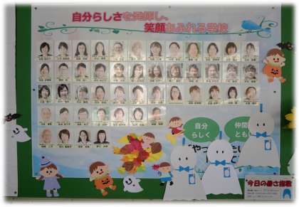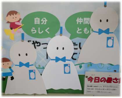 職員室前廊下の掲示板には、6年生の修学旅行時にも登場した校内支援員さん特製のてるてる坊主。効果絶大です!