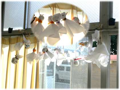 8組の窓際には多くのかわいらしいてるてる坊主が肩寄せ合っています。