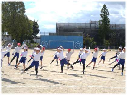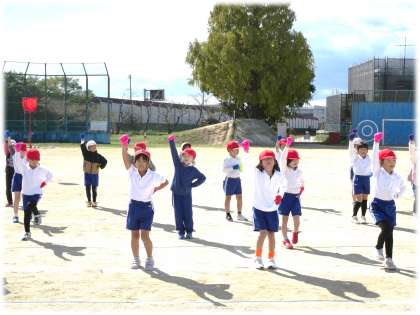 競遊種目では、玉入れ前のダンスを元気いっぱいに踊ります。動きと表情がマッチして、観る側の気持ちもうきうきさせてくれる、そんな1・2年生の元気を届ける表現になっています。自信をもって踊っている姿に、これまでの練習のがんばりを感じます。