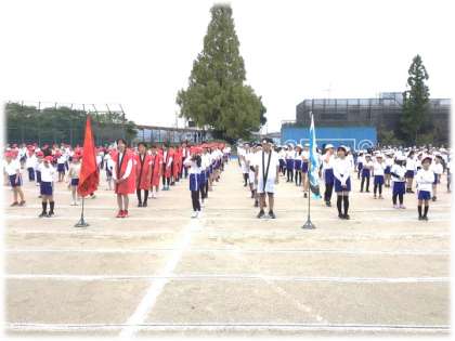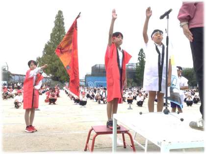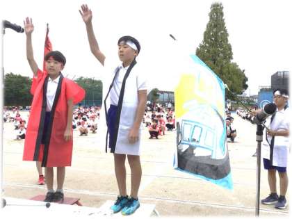 こちらは、開会式の様子です。選手宣誓では、赤白両応援団長が力強く、全力で競技に臨むことを宣誓しました。すてきな宣誓でした。
